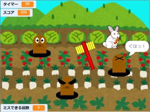 12月 ベーシックA 公開済み: 2025年11月24日更新: 2025年11月24日作成者: for-me 今月は畑の野菜を盗みに来るもぐらを、ハンマーで叩いて退治する「もぐらたたき」ゲームを制作します。 もぐらは次々と地面から現れるので、ハイスコアを出すには巧みな操作が必要です! また、今月はメインテーマが「メッセージ」となっており、複雑な処理を正しい順番で動かす方法を学びます。 コスチューム切替によるもぐらのアニメーションや、様々な変数管理もポイントです。