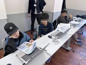 今回の授業では、Scratchコースの生徒さんたちはテキストの1日目まで完了!